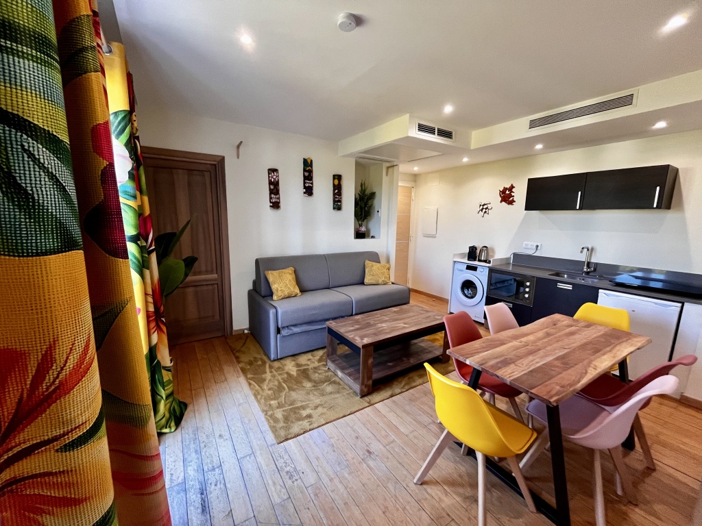 Situé au premier étage de la résidence Mandara Beach à Juan-les-Pins, le Faré de La Vahiné vous invite à un voyage dépaysant sur le thème tahitien. Cet appartement allie confort moderne, autonomie et évasion, idéal pour un séjour en famille, entre amis ou pour un déplacement professionnel.
